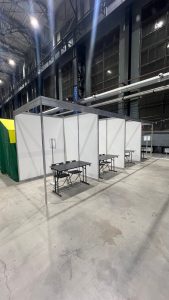 Наша команда реализовала стандартную застройку площадью 153 м², разделив её на несколько ключевых зон в соответствии с задачами организаторов и потребностями посетителей. Грамотное зонирование позволило создать комфортное, безопасное и легко ориентируемое пространство для всех участников мероприятия.