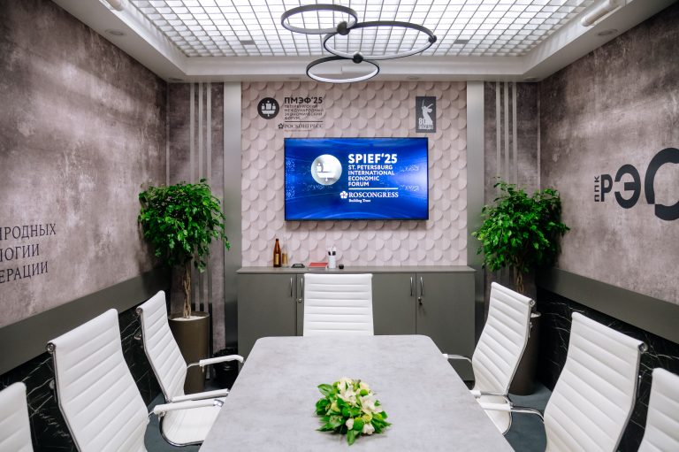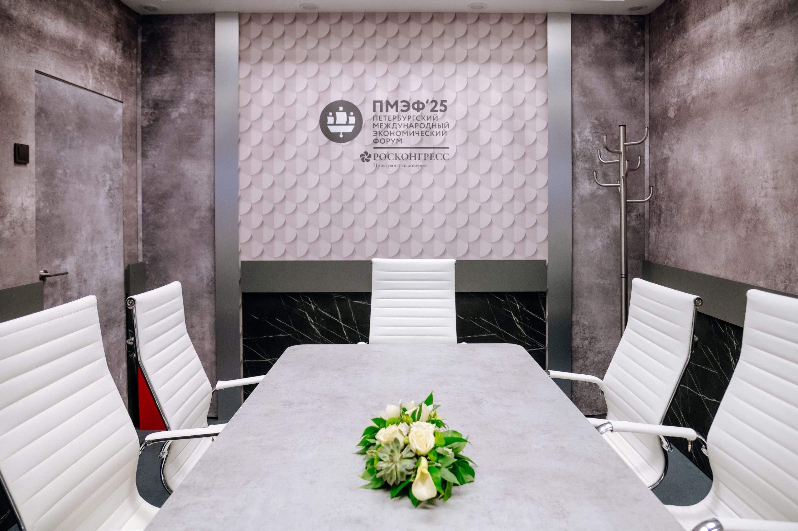 🔹 Зоны для переговоров — стильные белые кресла и столы с цветочными композициями обеспечивают комфорт для диалога, как видно на фото с переговорной зоной.