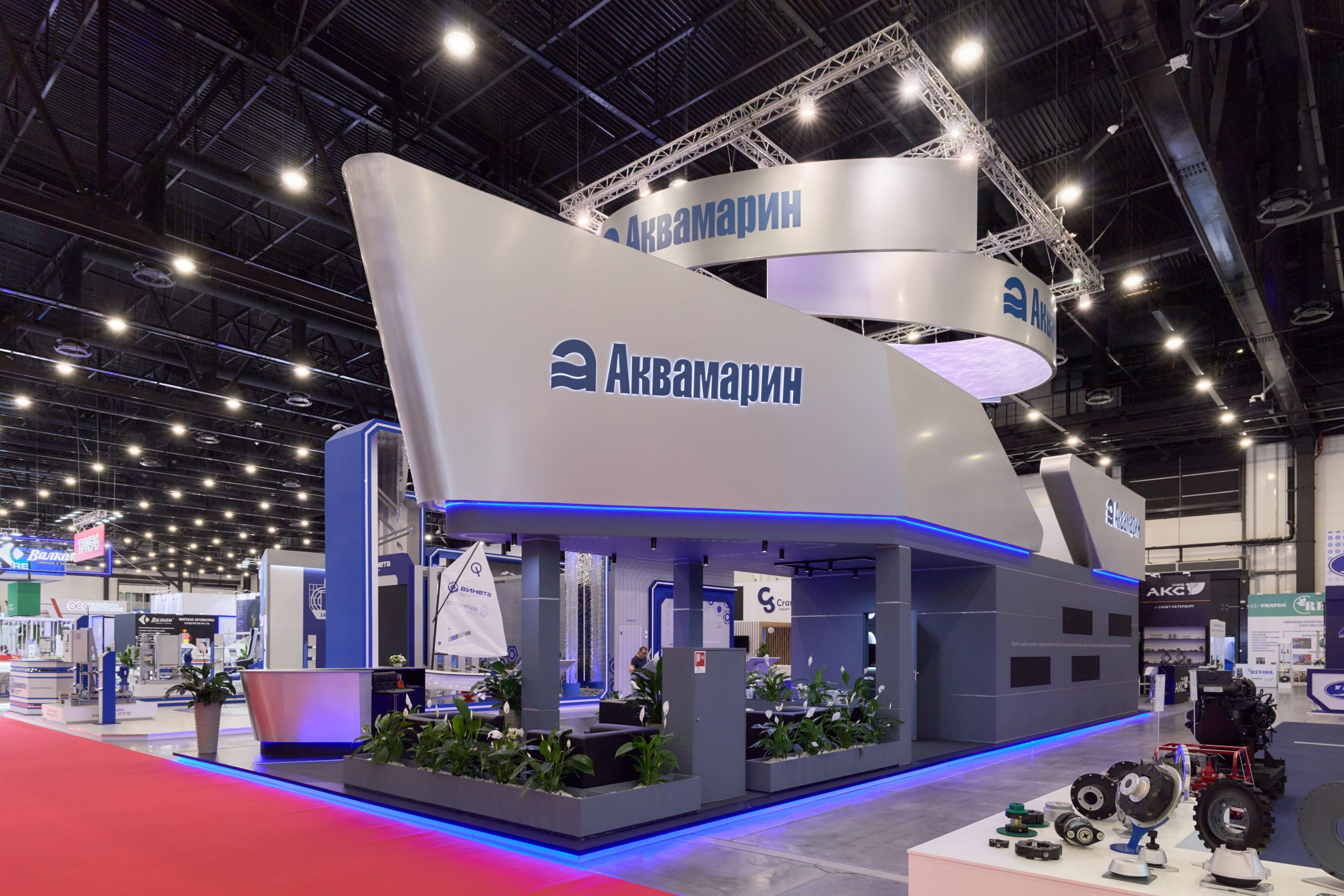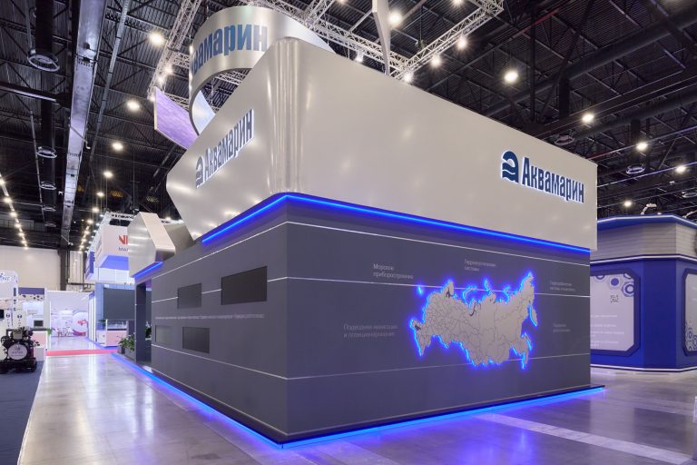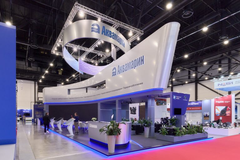 Концепция стенда гармонично сочетала строгий деловой стиль с морскими мотивами, что отражало специфику деятельности «Аквамарина». Дизайн включал элементы, напоминающие морские волны и корабельные детали, при этом сохраняя элегантность и профессионализм. Такое оформление помогло создать узнаваемый образ бренда и подчеркнуть его экспертизу.